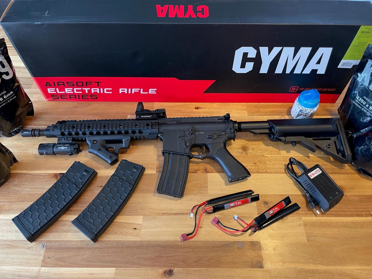 Le pack comprend : une réplique, trois chargeurs, une tige de nettoyage, deux batteries LI-PO 1450MAH 7.4V 20C T-CONNECT, un chargeur v3+ pour lipo/life 2s/3s, une poignée, une lampe torche, une visée Red Dots