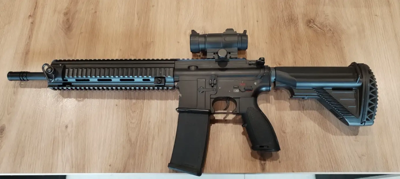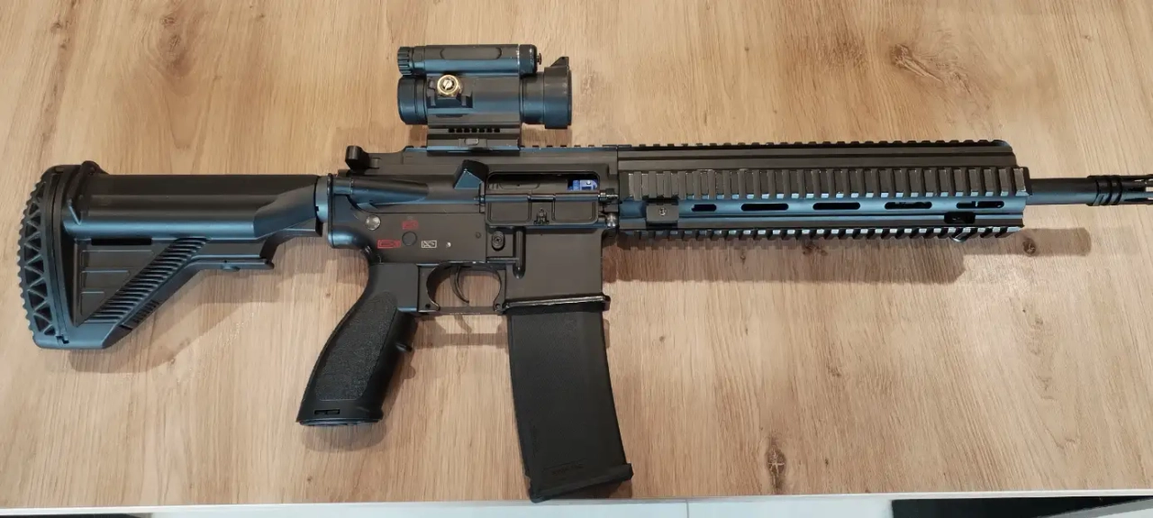 vend Hk416 full métal gear box origine QD pour un changement rapide du ressort. vendu avec 3 chargeurs supplémentaires low cap et le red dot. Le bolt catch est fonctionnel pour un réglage du hop up facile. envoi possible. photos et renseignements supplémentaires sur demande.