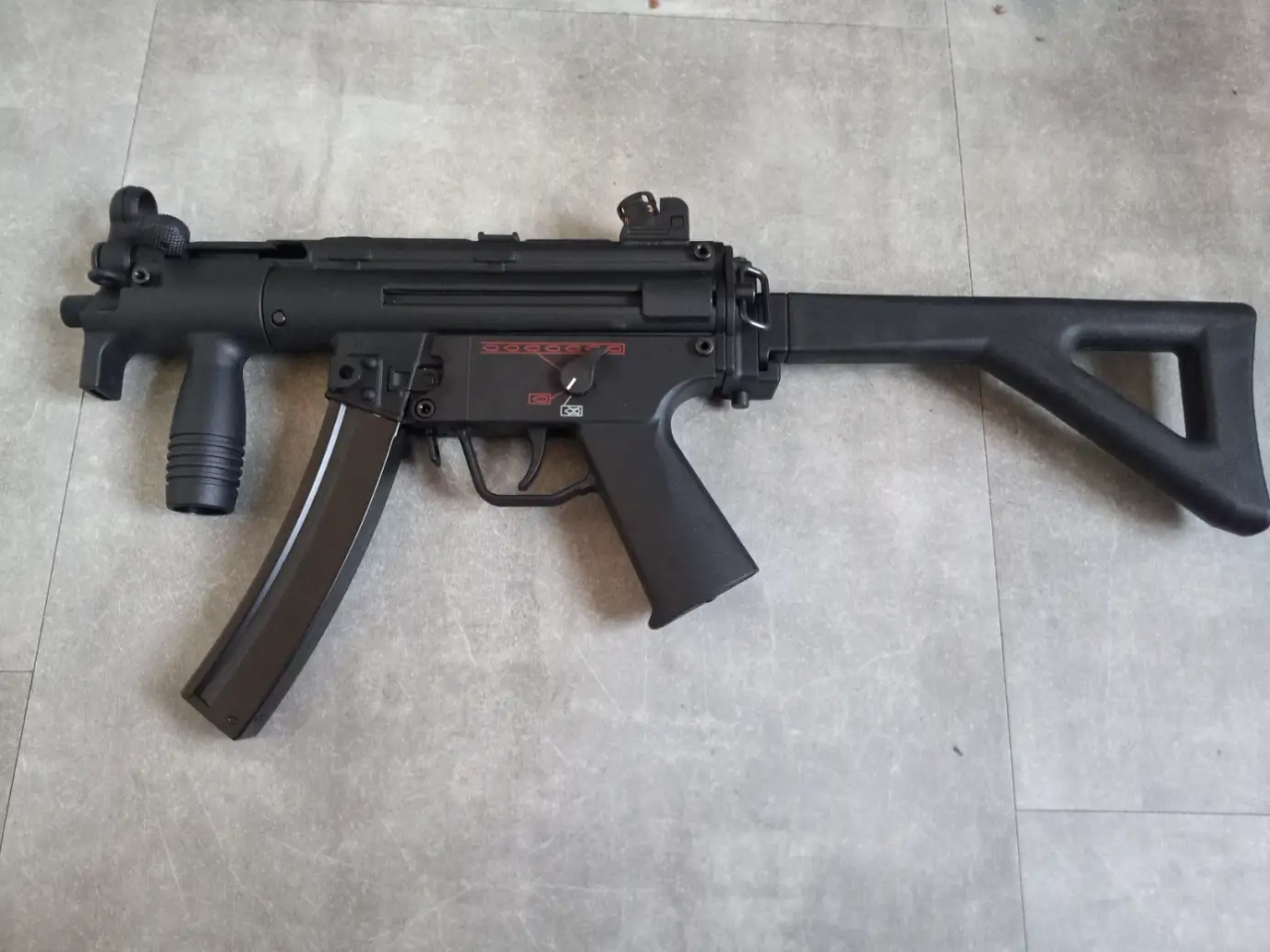 Il est neuf de chez neuf, acheté pour collection. Il s'agit à l'origine d'un MP5K standard (A4) auquel j'ai rajouté une crosse de PDW en option de la même marque. Il est fourni également avec son end cap et son chargeur d'origine.