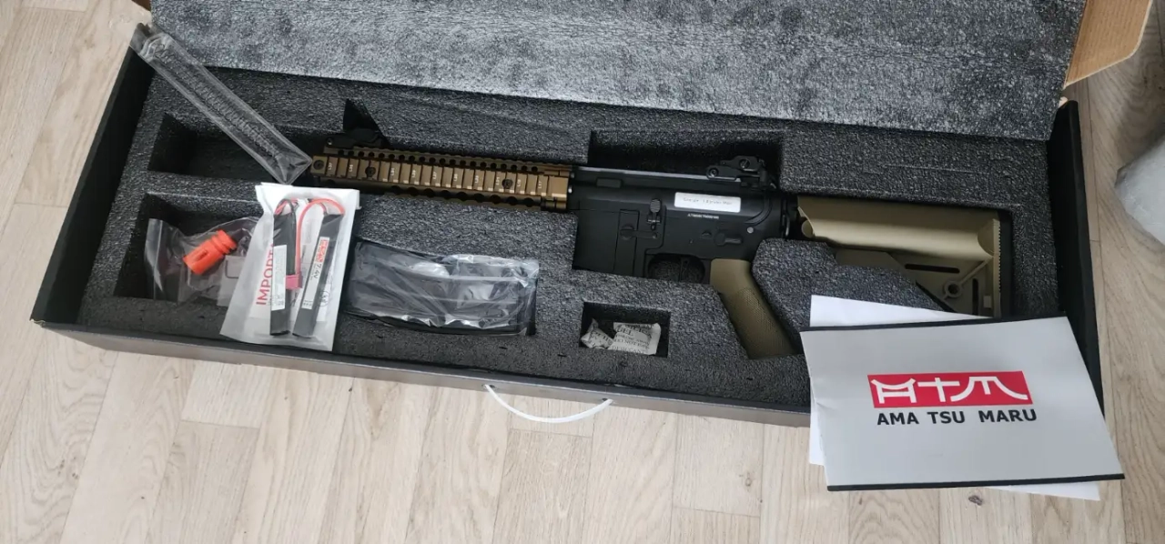 Description et contenu de la boite sur Airsoft-Entrepot : https://www.airsoft-entrepot.fr/all-catalog/repliques/ar-lmg-dmr/aeg/atm-mk18-mod-1-ht-bdl.html