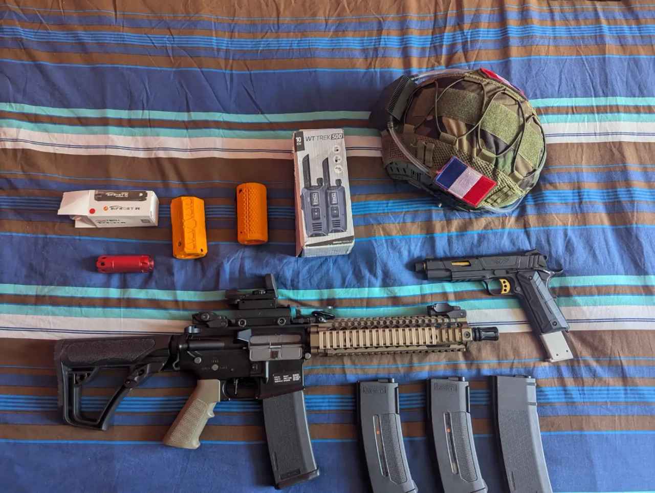2 chargeur m4,2 chargeur pts, lampe torche, traceur de billes,2 batterie + un chargeur.