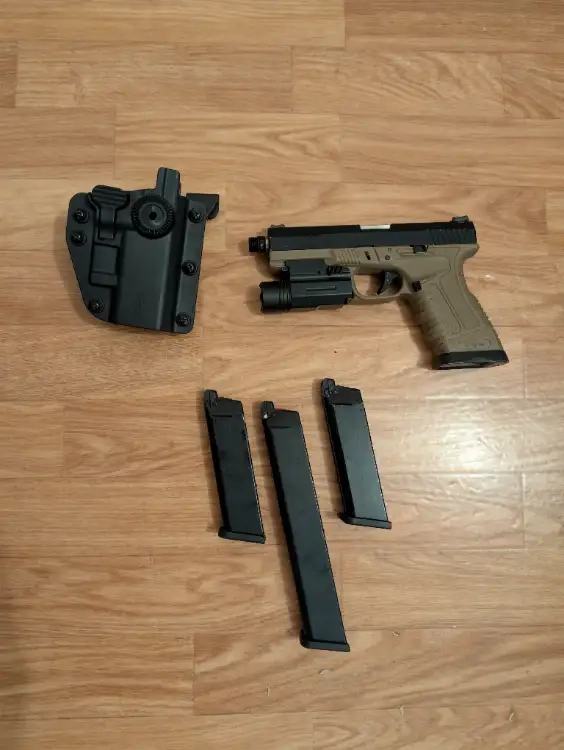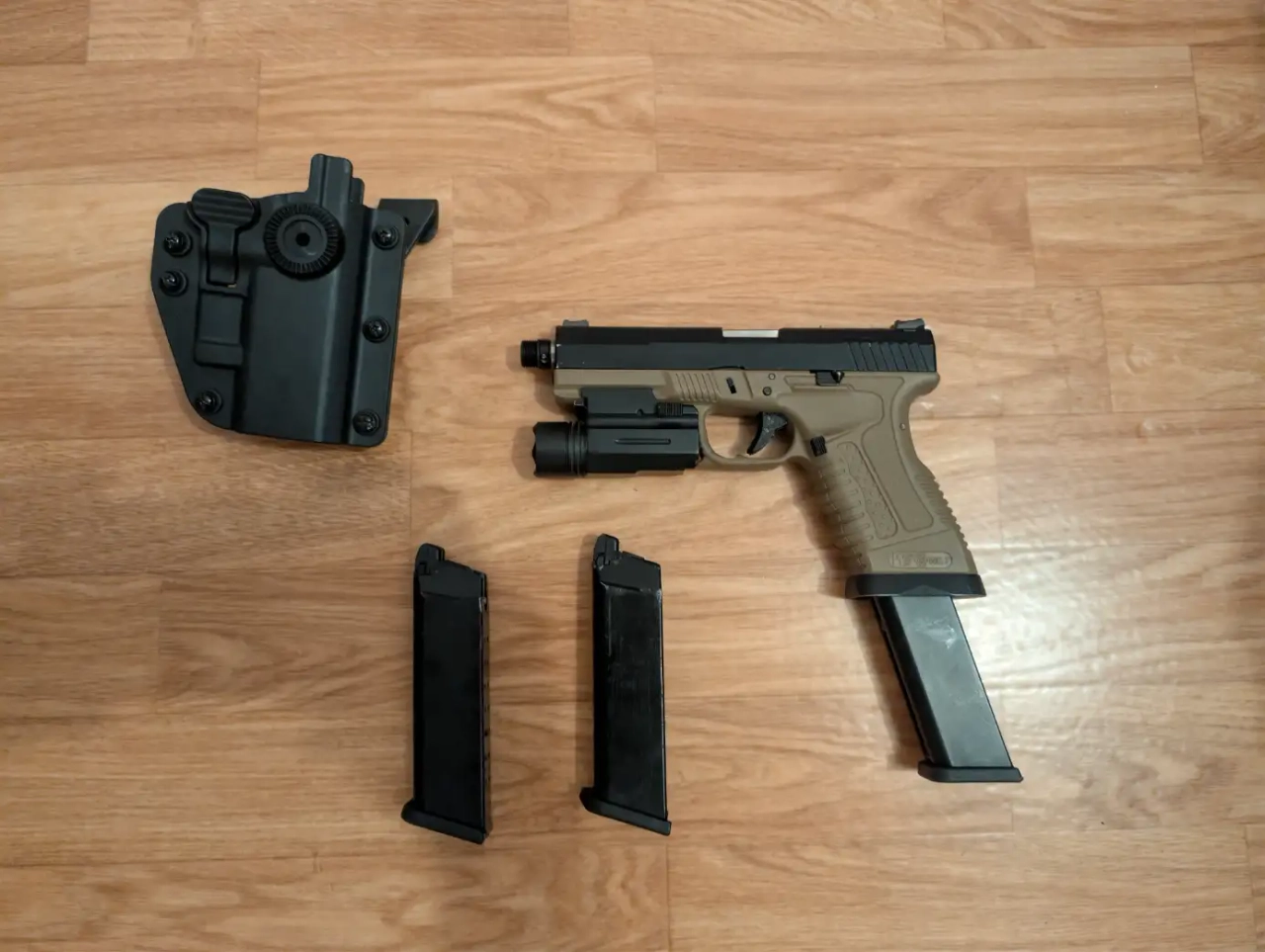 Glock17 we a vendre avec holster ainsi que la lampe réplique upgrade canon 117mm maple leaf joint hop up 50° mapple leaf block hop up mapple leaf prix négociable