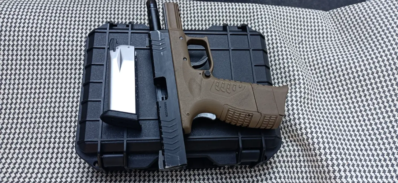 Fournis avec son chargeur d'origine [+ un talon alongé tan] et un deuxième chargeur H.S (valve de chargement en gaz manquante et poussoir à billes fonctionnelle mais la tirette pour y insérer des billes est cassé, nécessitant beaucoup de force pour pouvoir le tiré vers le bas ; +/- 8€ de pièces pour le remettre en marches)