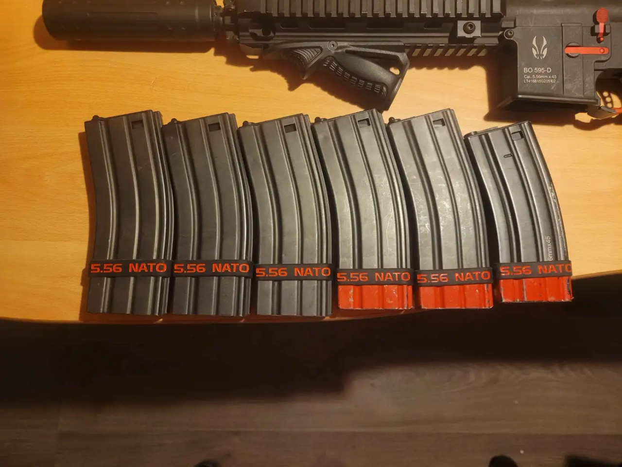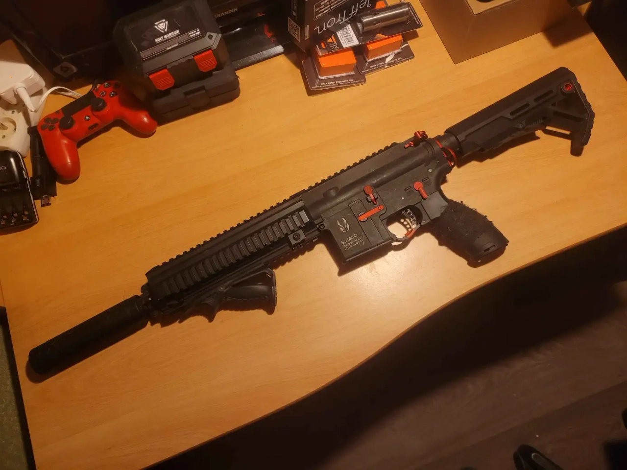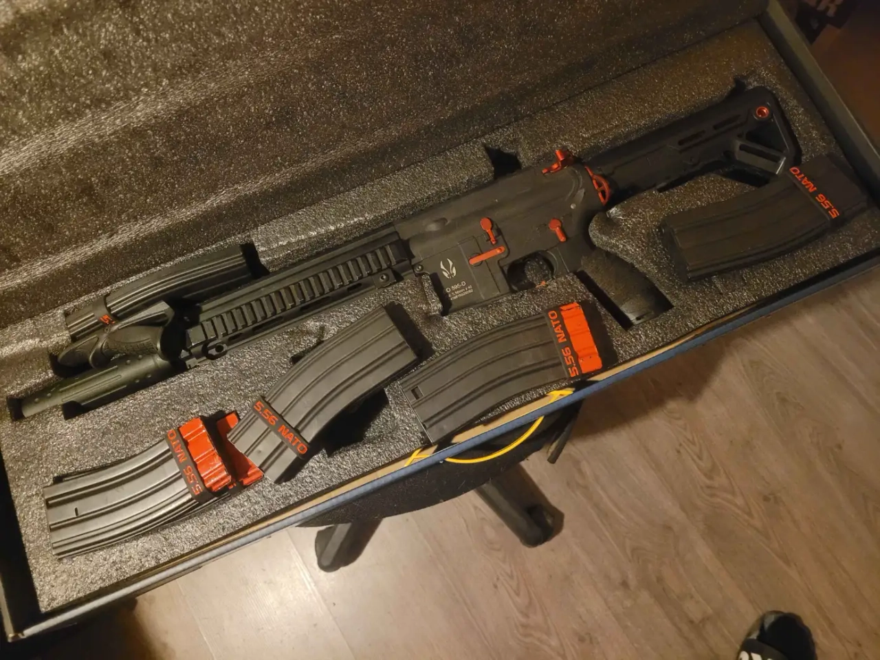 Je fournis avec, la poignée angulaire, le silencieux ainsi que 6 midcaps (celui dorigine + 5 bo-manufacture, tous fonctionnels)