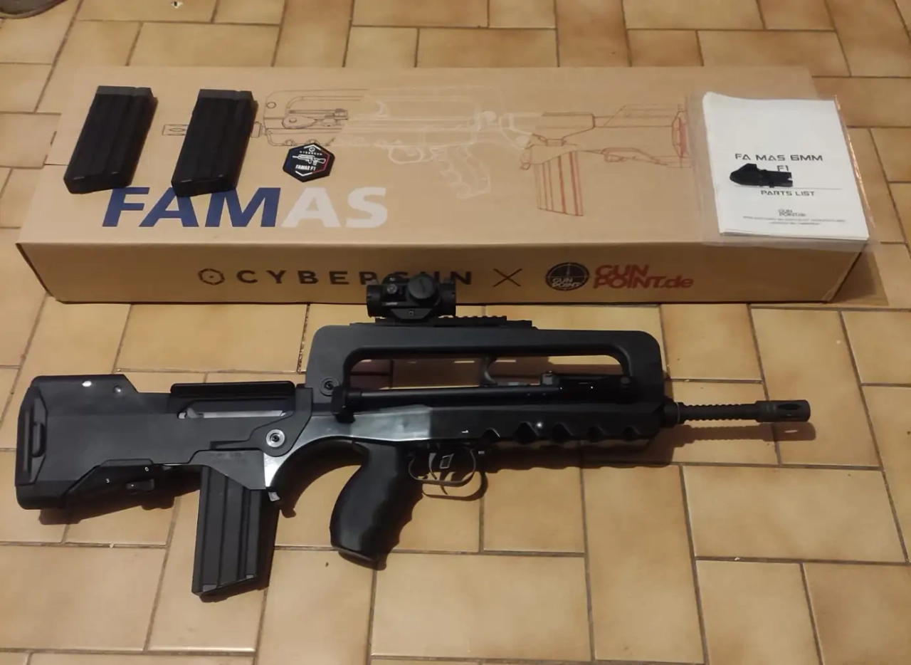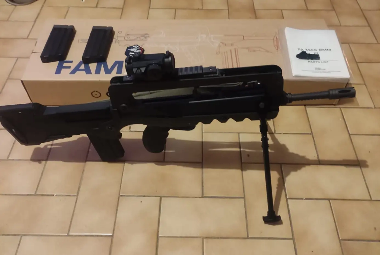 Il est vendu avec 3 chargeurs (6 followers pour passer les chargeurs en 33 coups au lieu de 25), la boite d'origine, les manuels, le patch Famas, une sangle RS des années 90, un rail picatinny en impression 3d Carbone (atelier GBBR) retouché à la dremel pour être plus bas et moins flexible. il y a également une pièce en impression 3D pour retirer le jeux du garde mains.