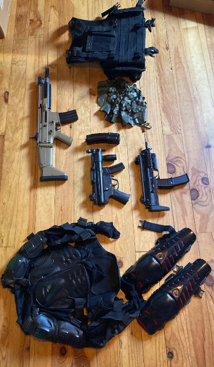 - Scar-L FN Herstal Cybergun (1,3j et ABS/metal) : 1 chargeur hi-cap, une batterie NiMh 8,4V et un chargeur de batterie inclus. Carton d’origine avec