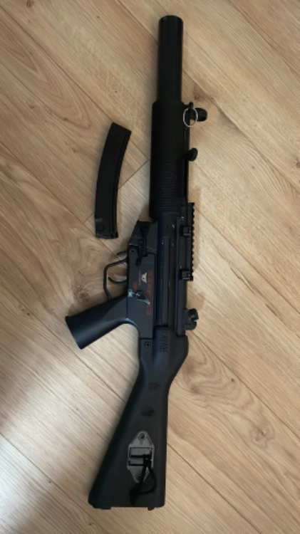 - un mp5 jing gong avec 1 chargeur grande capacité, un rail sur le dessus, 2 crosses rétractables (la crosse sur la photo n’est pas à vendre, je l’ai gravé)