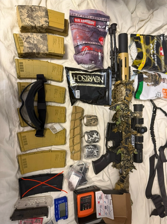 17000 billes de stock des pièces de rechange électronique et ressorts moteur un gilet protection, l’arme possède un viseur et un trépied ainsi qu’une lanière.