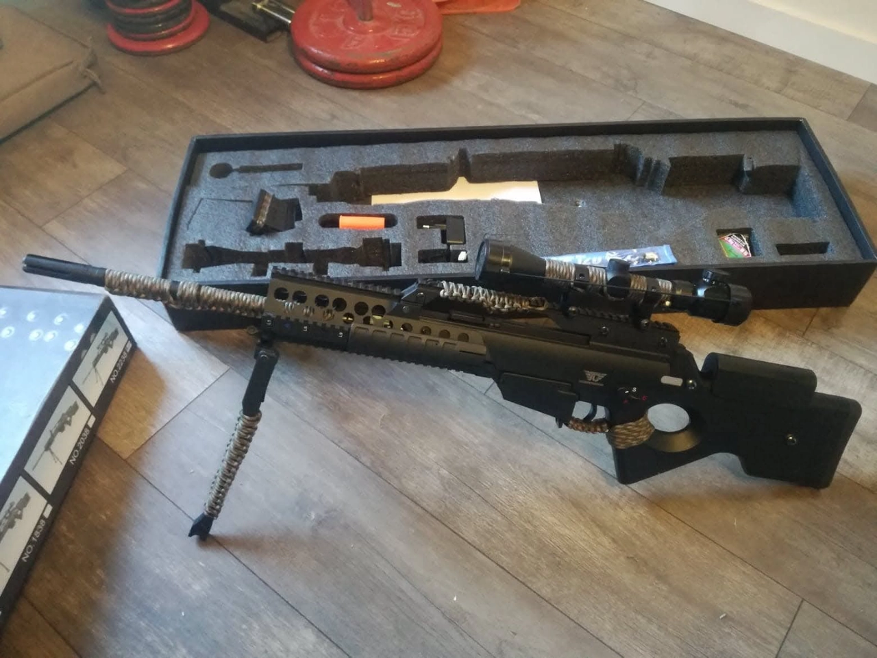 Je n’ai plus le cartons d’origine, mais la réplique sera vendu avec une housse. La réplique avec le bi-pied, une lunette zoom, et une petite red hot sur le côté.