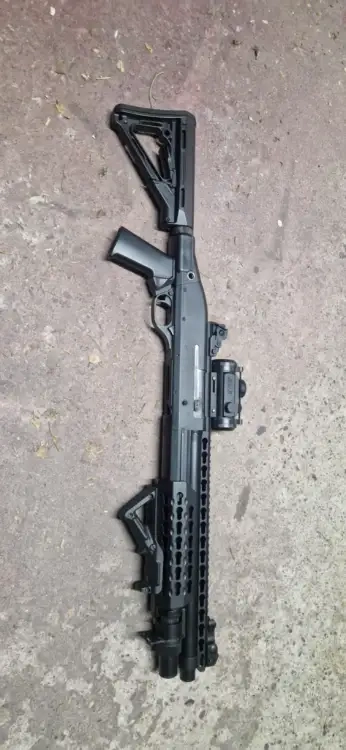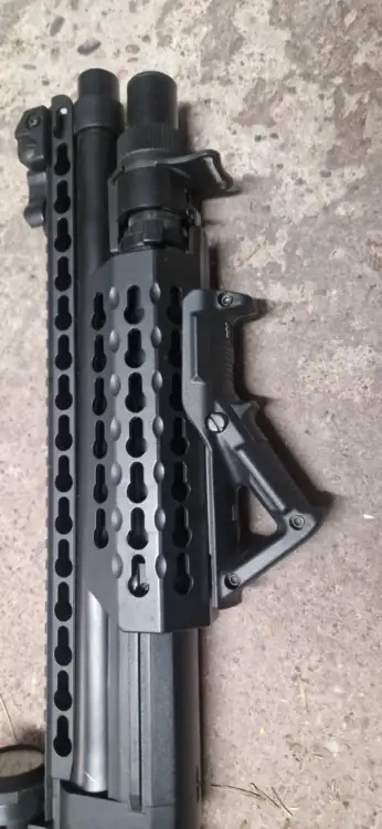 Fusil à pompe spring Secutor velite V en parfait état vendu avec une poignée angulaire, un viseur point rouge, les 3 cartouches d'origine (estampiller secutor) ainsi que quelques cartouches en plus.