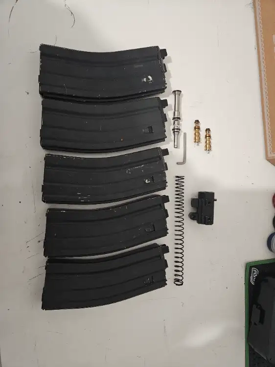 Niveau chargeurs, 2 chargeurs V2 Gaz sans fuite, un avec une esthétique très correcte, un avec une esthétique plus usé et 5 chargeurs V1 3 Gaz et 2 Co2.