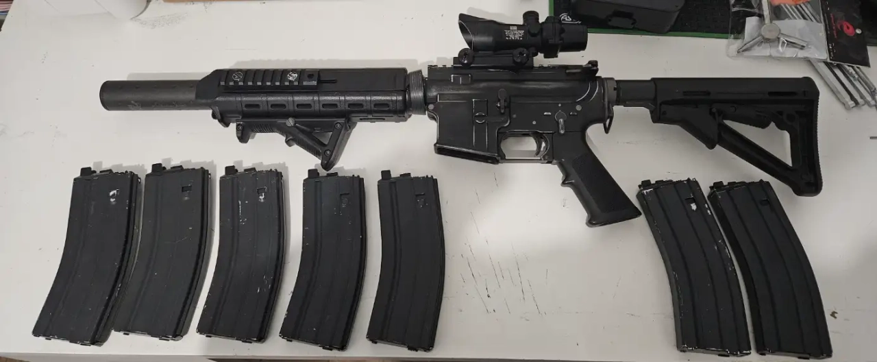 -Replique avec une boîte neutre avec garde mains, crosse et poignée vertical en repro magpul, deux rails picatiny, silencieux.