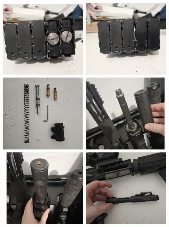 Un silencieux à filetage interne avec marquage et deux rail picatiny dont un sur lequel une repro de AFG magpul est installer.