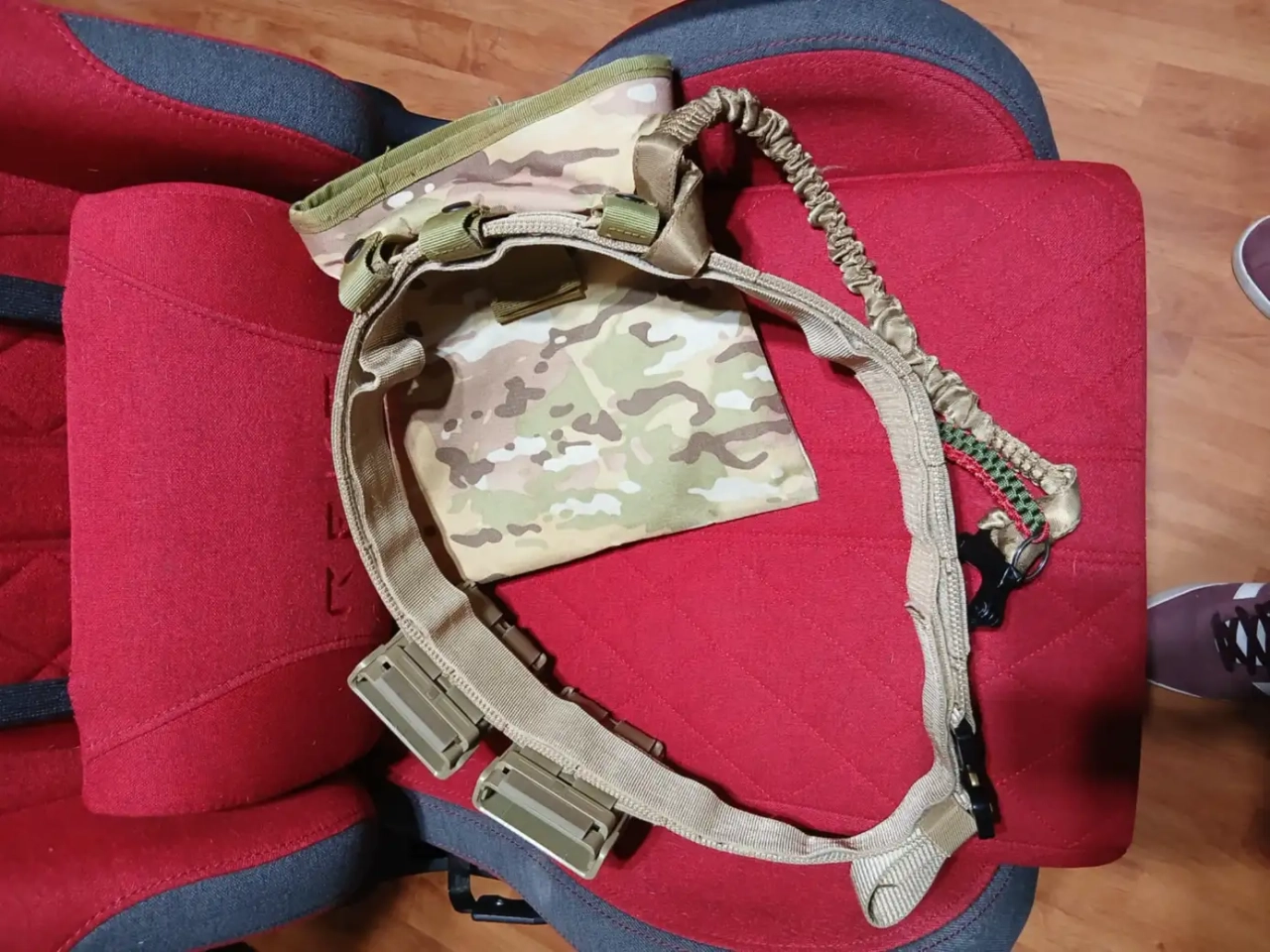 Je met en vente un gilet tactique équipé de nombreuse poche et d'un sac, une ceinture passant molle a boucle en metal avec sa sous ceinture a velcro et c'est accessoire, et un bob