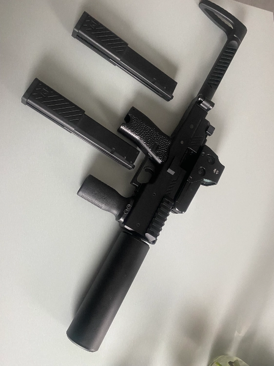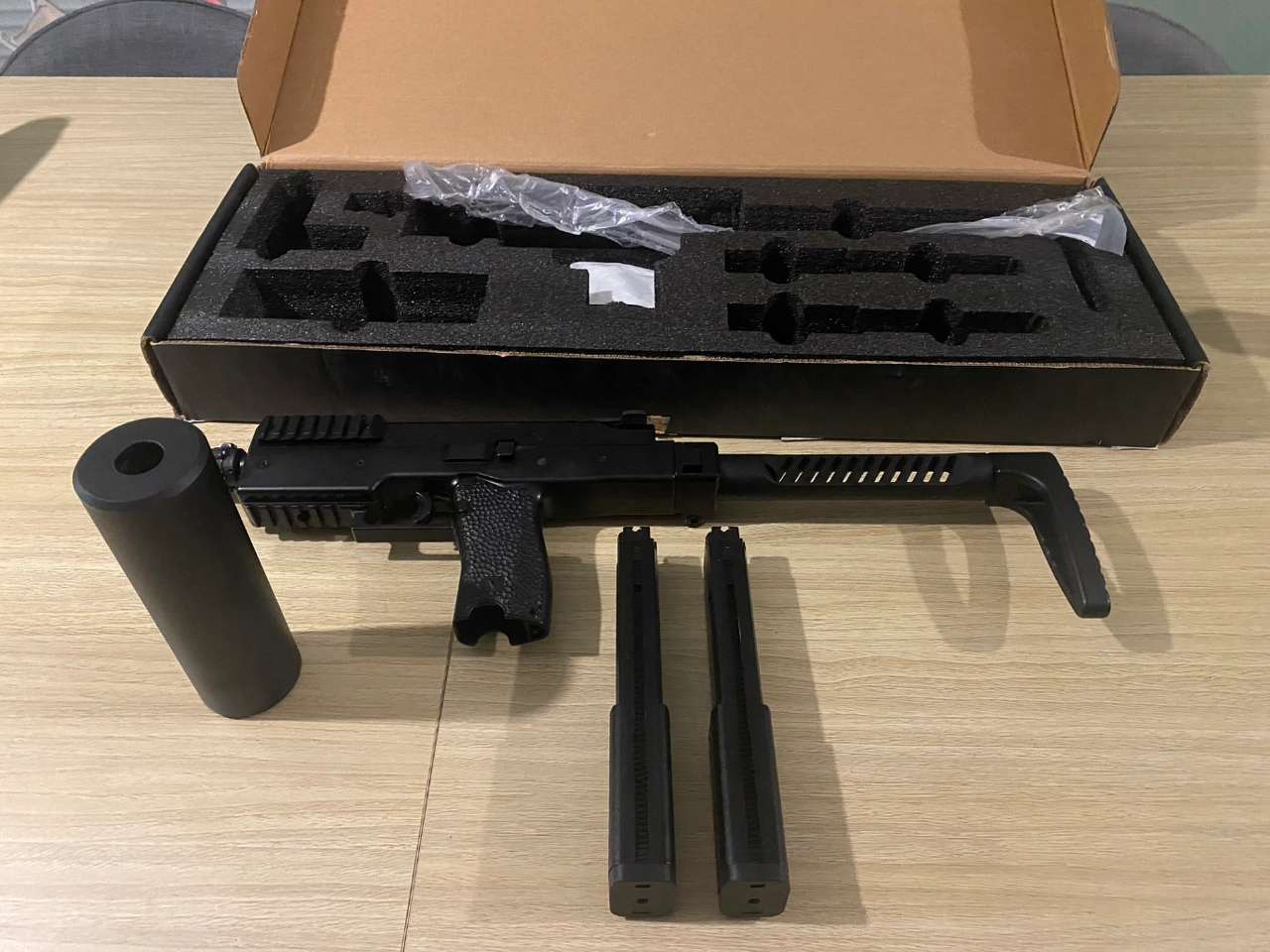 Avec la boîte d’origine, le silencieux, deux chargeurs, poignée, et viseur.