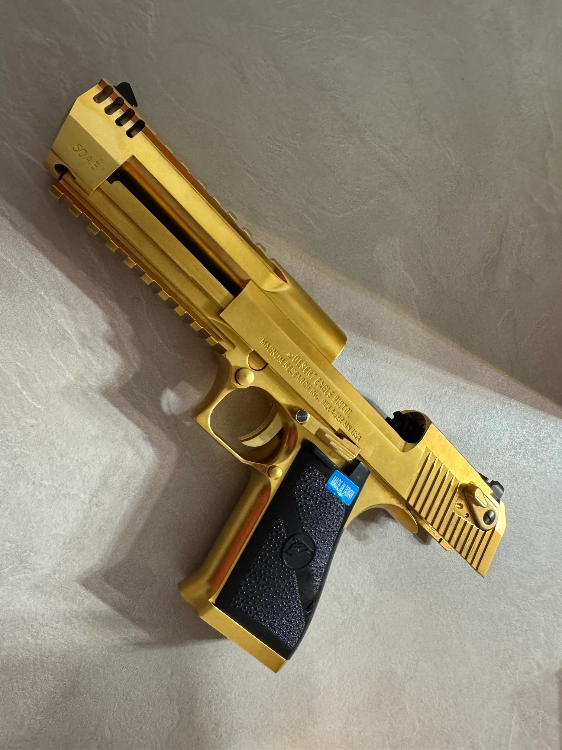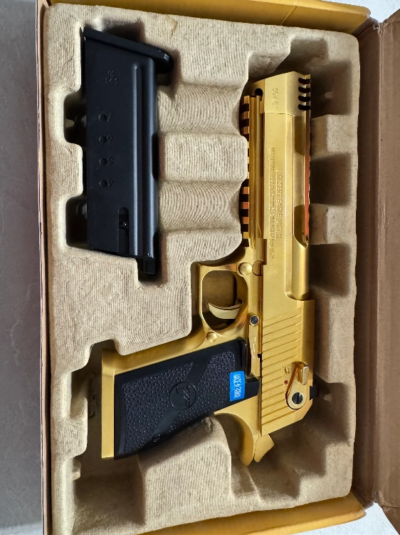 Desert Eagle édition gold de marque WE/Cybergun. Réplique assez rare, n’a jamais était sur terrain. Fournis avec boite, chargeur et tige de remplissage.