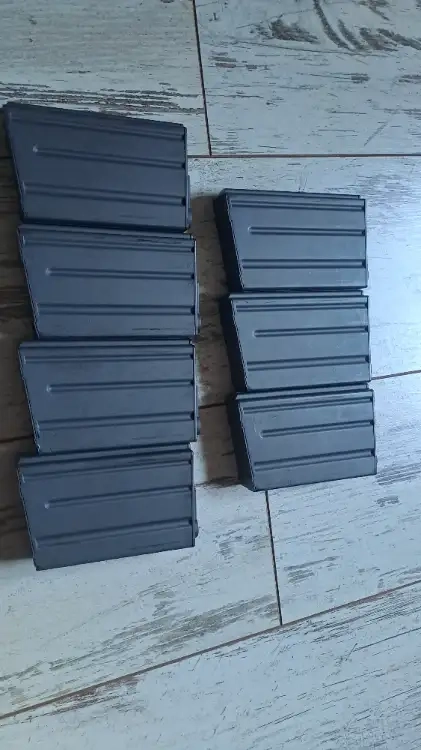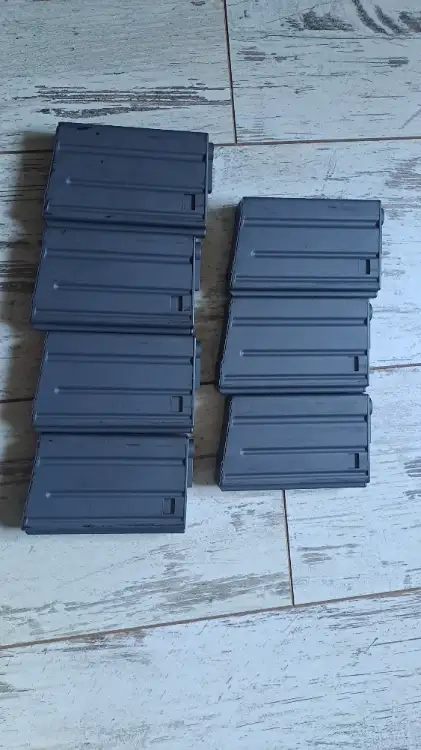 Je vend mon lot de 7 chargeur pour m4/m16 de la marque mag, 90 coût, style chargeur stanag m4 20 coup, en plastique gris pour m4 aeg, style vietnam