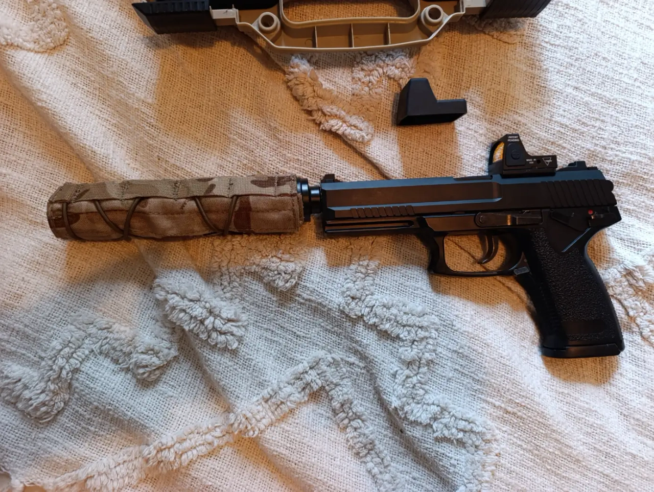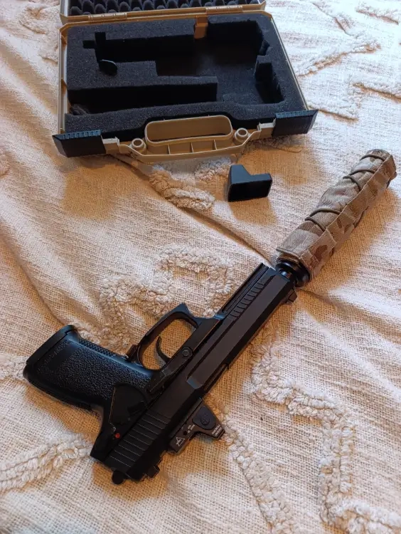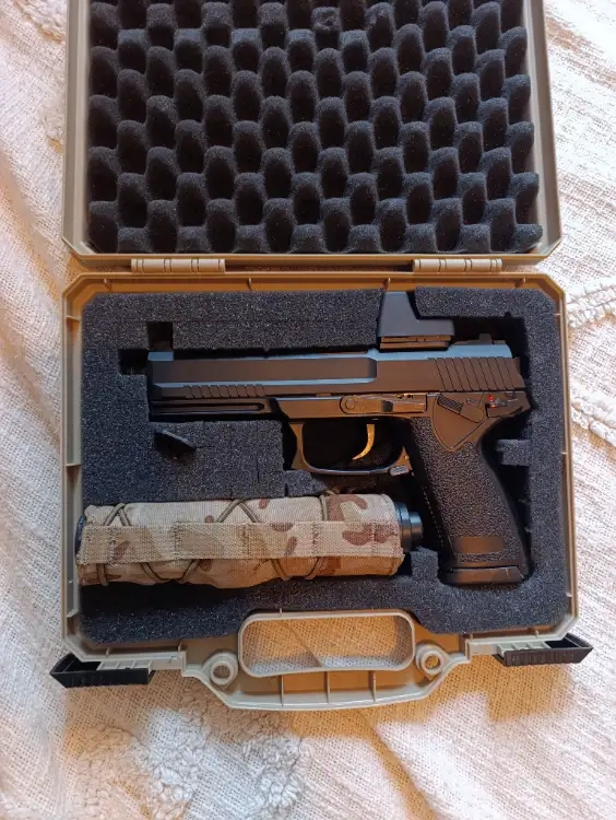 La réplique n'est pas modifié, a part le silencieux ou j'ai mis des mousse pour une réelle efficacité, et l'installation d'une micro redhot. Je vend avec la mallette rigide et le couvre silencieux.