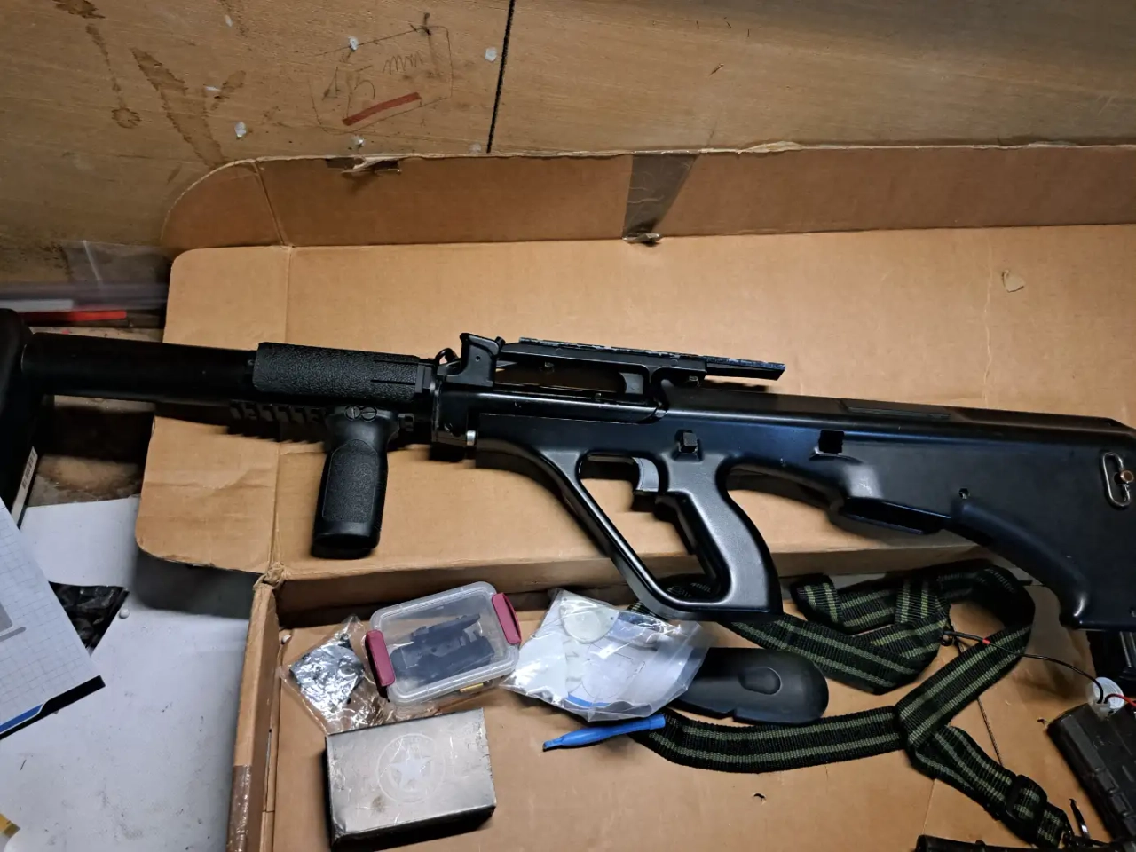 Cage moteur manquante → une cage moteur Steyr AUG de chez Jing Gong est compatible (facile à trouver).