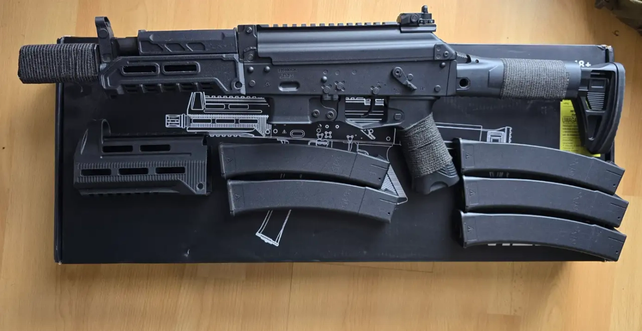 Garde-main remplacé par un modèle Strike Industries imprimé en 3D (voir photos). Celui d’origine sera fourni.