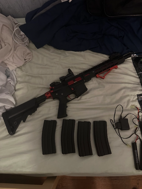 -Réplique M4 colt Hornet red fox aeg full métal avec red dot rajouter + poigne ergonomique rouge.