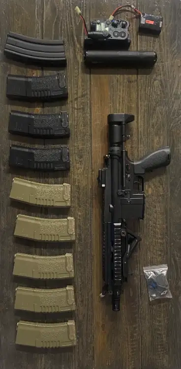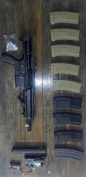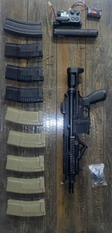Bonjour, je mets en vente cette 416 C de chez E&C. La réplique est vendu avec deux batteries ATM 7.4V qui se loge dans un AN/PeQ16 factice de chez tokyo marui. La réplique est accompagnée d'une poignée tactique angulaire (je n'ai pas la marque), 9 chargeur, 5 tan amoeba mid-cap, 3 black amoeba mid-cap, 1 hi-capa d'origine ainsi que de son petit lot de pièce et clé d'origine. Vendu avec un silencieux G&G GOMS MK1.