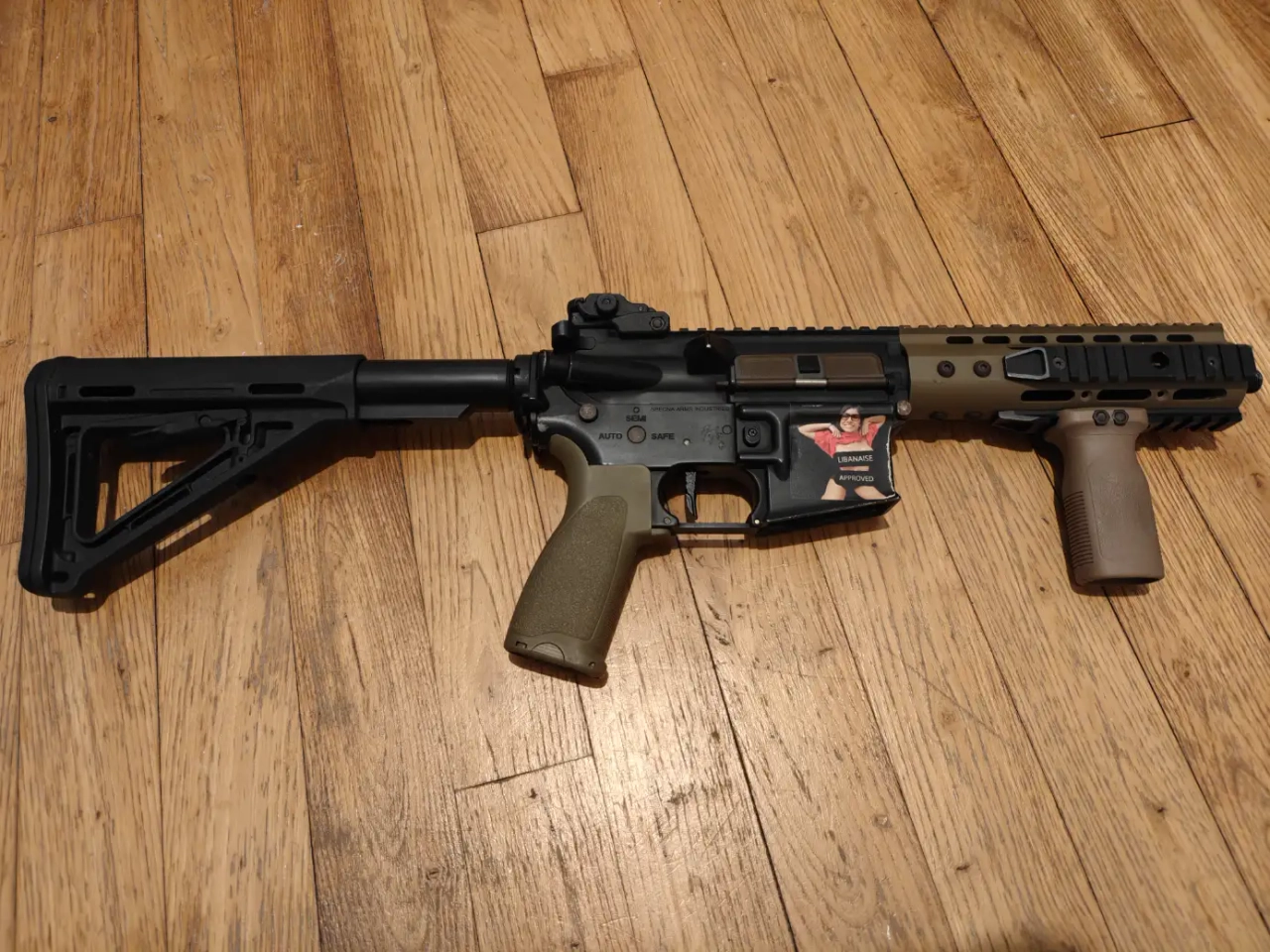 En externe elle a une fausse poignée magpul et une vrai crosse magpul