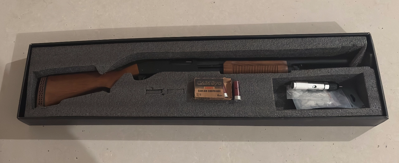 Vends une réplique de pompe à cartouche, éjectable avec capuchon pour cartouche et un injecteur de CO2, version police vraie bois boîte d’origine complète en super état
