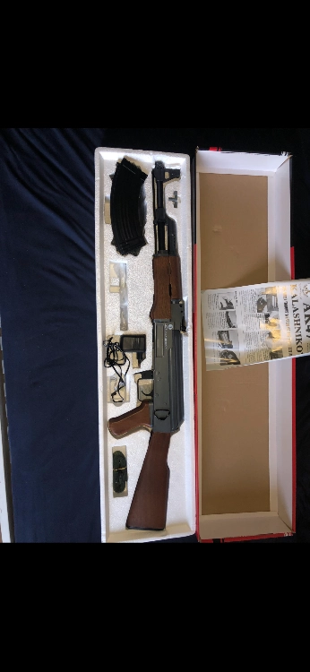 Je vends une réplique AEG Kalashnikov AK47 électrique, quasi neuve, complète dans sa boîte d’origine.
