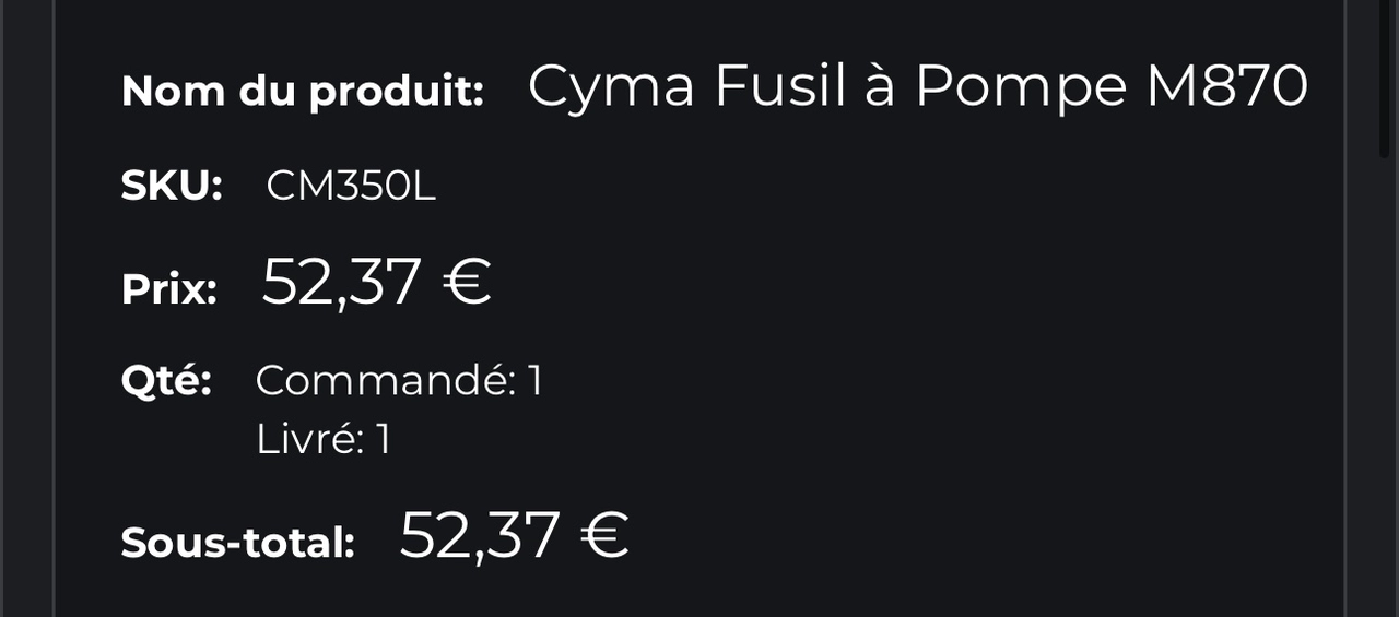 Vend fusil à pompe cyma m870 jamais jouer acheté 52 euro avec une cartouche , je le vend 40€ négociable