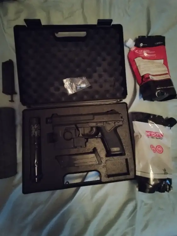 Bonjour, je vends une réplique d'airsoft mk23 Tokyo MARUI en bon état très peu utilisée avec des accesoires : un couvre silencieux, un joint hop up mapple leaf neuf, deux sachets de billes, et un bb loader.