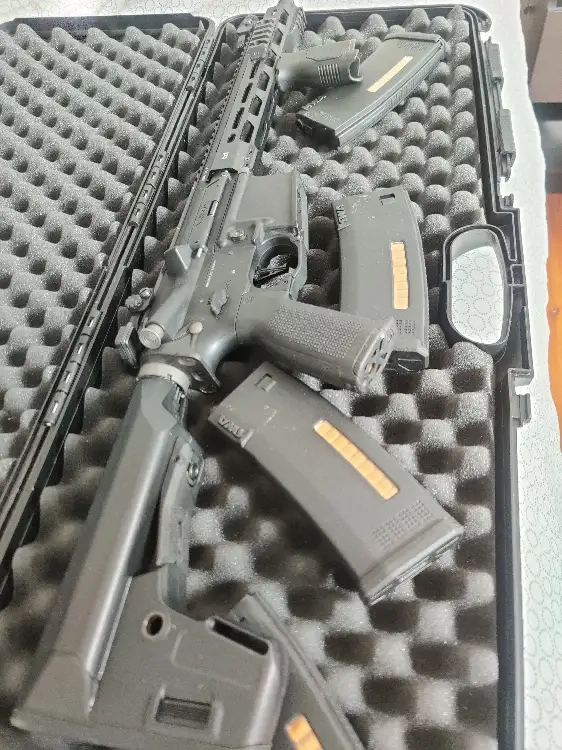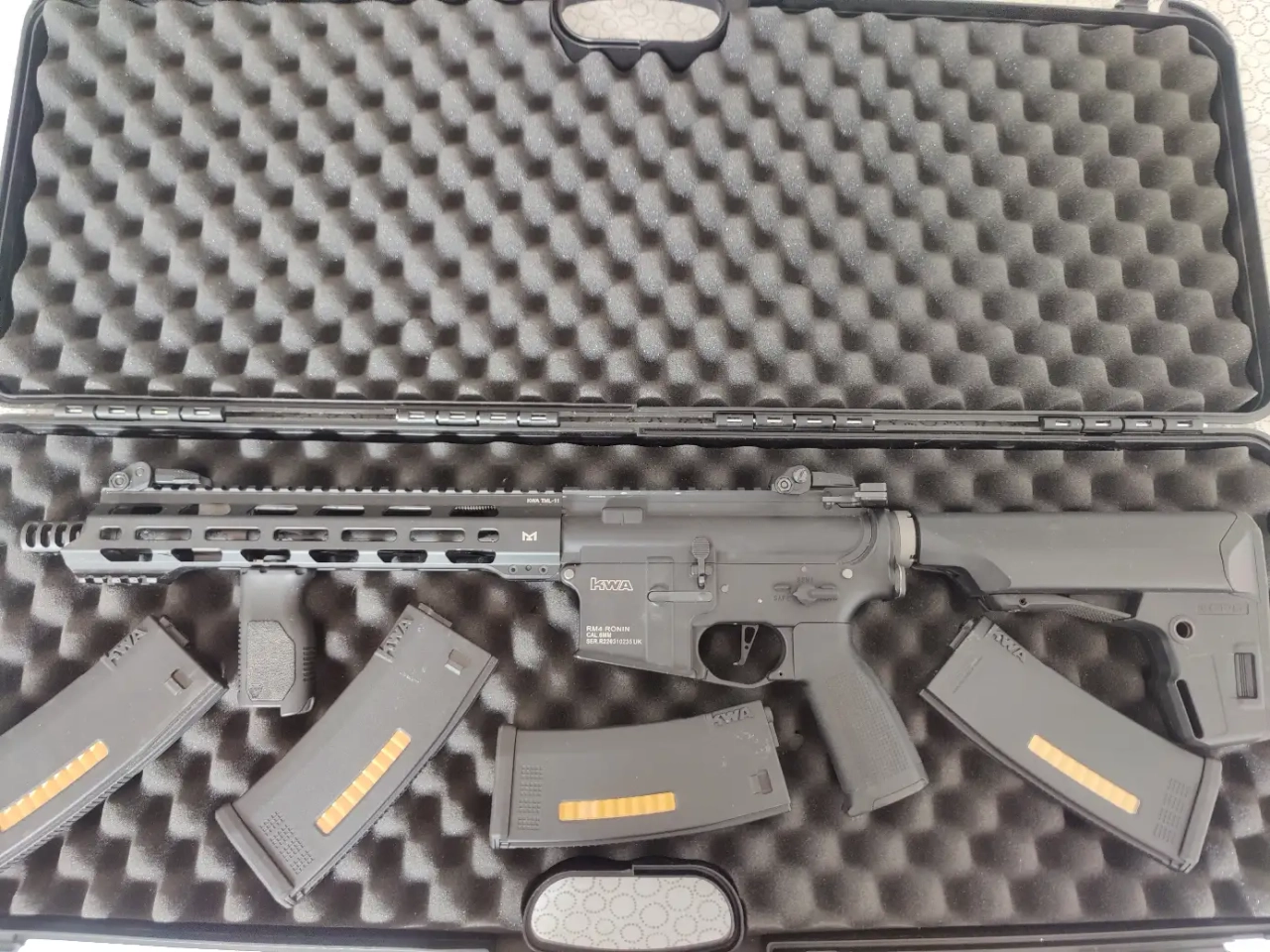 Je la vends avec 4 chargeurs KWA MS120c (chargeurs ajustables de 30 à 120 coups, avec follower) ; sachant que la réplique est également compatible avec des chargeurs PTS ; ainsi qu'une malette EVOLUTION.