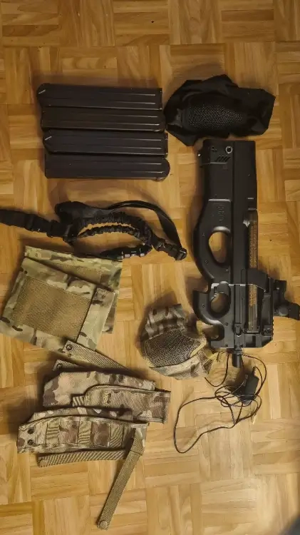 Je met en vente mon P90 AEG FN HERSTAL. Il est vendu avec son chargeur d'origine, un viseur point rouge, 4 chargeurs de 170 billes, fixation pour Sangle, 2 porte chargeur (2 chargeurs par poche), 1 sangle, 2 poches avec scratch ainsi que sa batterie et son chargeur.
