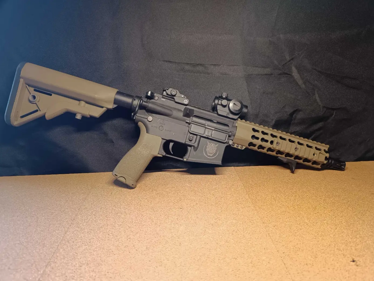 vend m4 saigo défense custom en biton, garde main keymod avec handstop, viseur point rouge micro T1