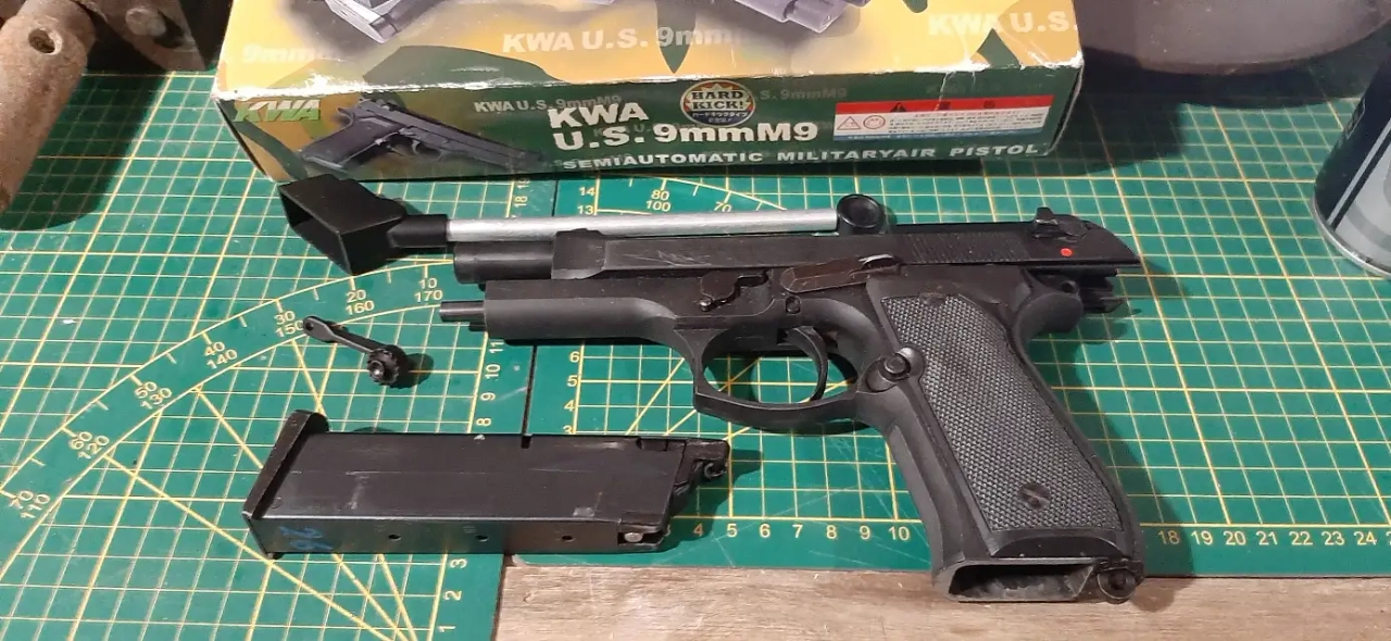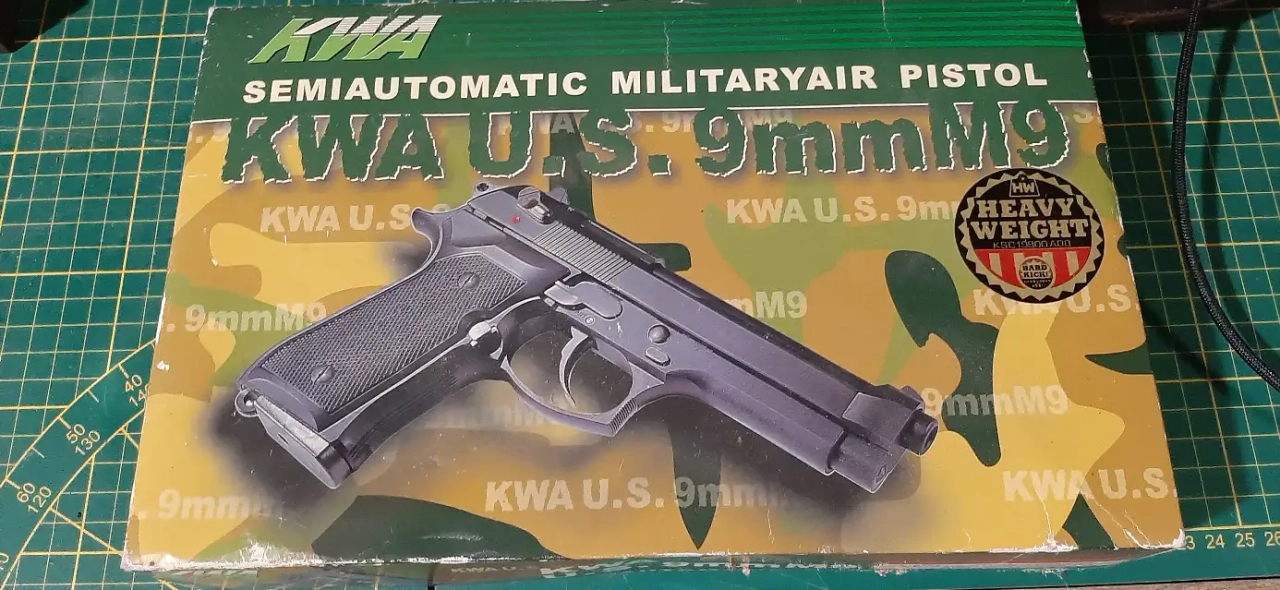 Une réplique de M9 vintage, simple et double action, levier de désarmement du marteau fonctionnel, en parfait état de fonctionnement. Bon au chrony ca ne dépasse pas les 0.6J à la 0.2. Le kick est léger et le chargeur métal se refroidi rapidement. La réplique est en ABS mais a l'allure un full métal (poids 960g, chargeur full métal!). A noter aucun marquage. Vendu avec la clef de réglage du hop up et un bb-loader spécifique. Jamais utilisé à l'exterieur, quelques traces d'usage (vue l'age...). Avec la boite d'origine et le livret!!