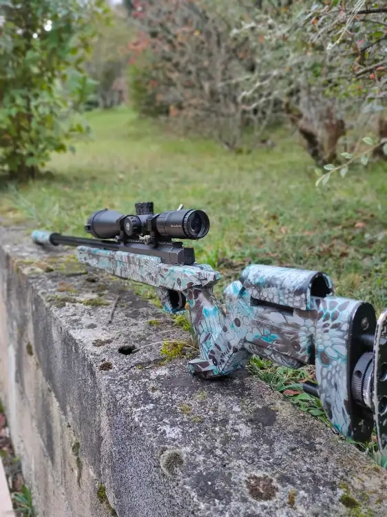 Silencieux perso manchonné avec tube mitraillette et mousse, réduit drastiquement le bruit. L’ensemble du snipe a été travaillé pour réduire considérablement le bruit, il est très silencieux (barrel spacer *4 entrecoupé de mousse, crosse isolé, etc…).