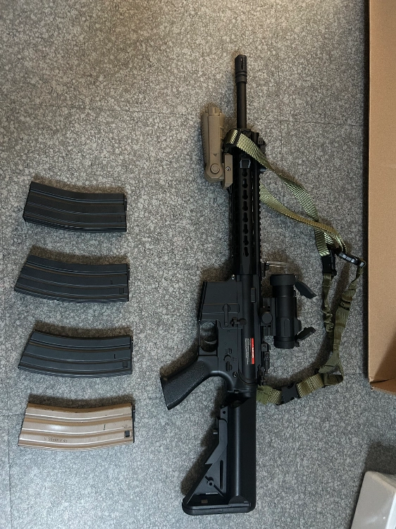 Je met à la vente un lot de réplique et d’équipement appartenant à un proche de ma famille , le lot comprends une m4 canon long avec 4 chargeur de capacité 300 à 500 en métal ainsi qu’un viseur Aog point rouge une poignée amovible , une protection de lunette , une sangle 1 point , un Pa full abs de secu avec 4 chargeur quasiment neuf 1 bouteille de gaz neuve , 1 paquet de 5000 bille 6mm 0,25g compatible pour les 2 répliques , un casque mich , une protection qui se fixe au casque lavable avec des attaches de rechange , un holster de cuisse universel , 3 talkies en l’état fonctionnel , le carton d’origine de la réplique longue , 2 tiges de débourrages et un bbloader .