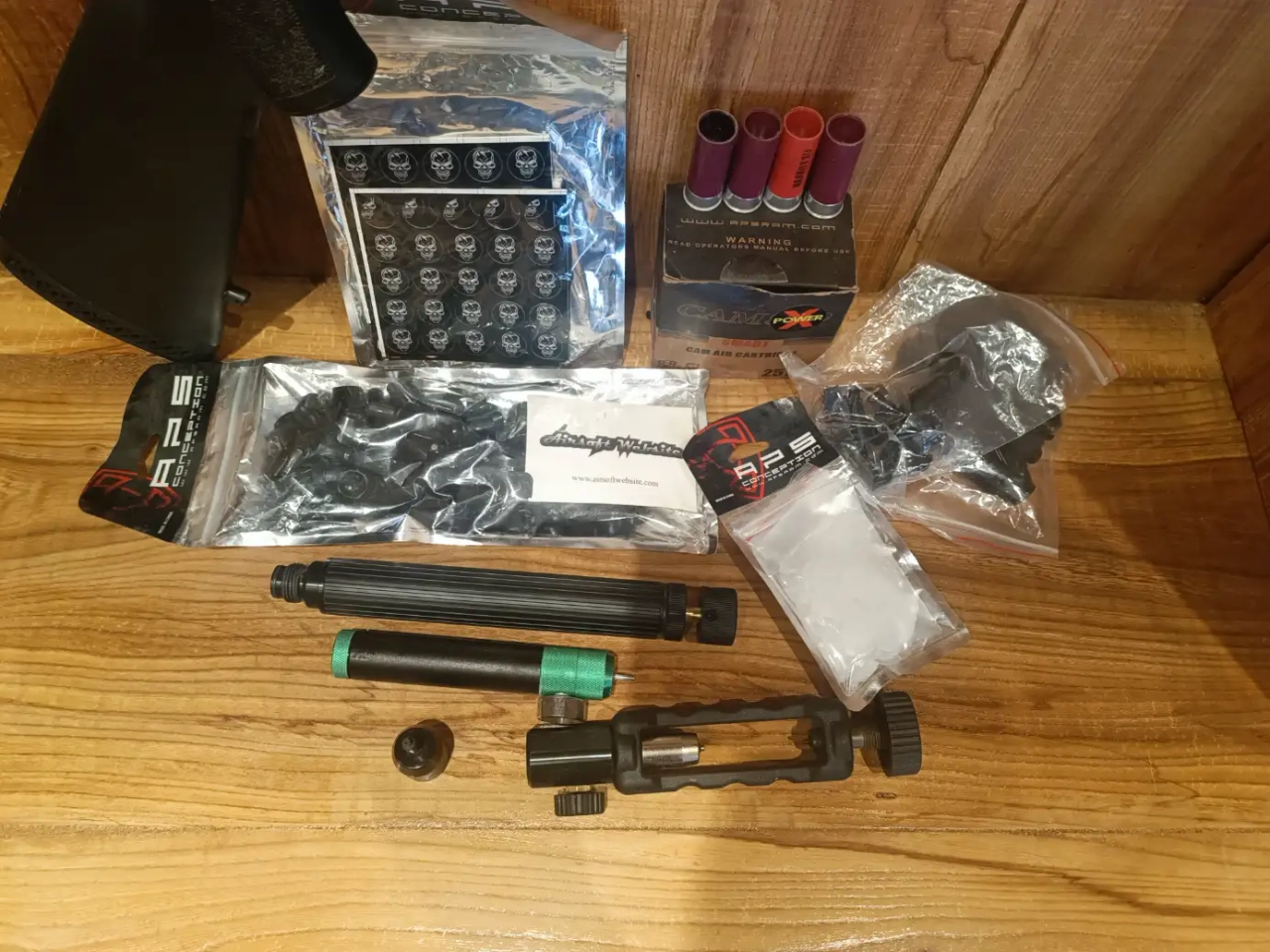 je le vends avec tout un tas d'accessoires, environ 25 cartouches, des bourres, des capuchons pour les cartouches. Ainsi que tout le nécessaire pour recharger les cartouches au Co2 ou en Hpa