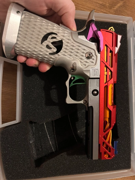 Bonjour à tous je mets en vente mon hi capa par manque de temps le capa a 2 ans fait par art custom je vous fait par les liste de pièces qui a était fait dessus la seule pièces D’origine qui reste c est la frame