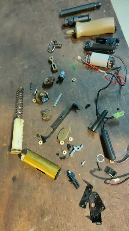 A vendre cause passage HPA, tout l'interne de la gearbox d'origine d'un AUG A2 Jing Jong (moteur engrenages piston cylindre tete de cylindre ressort tape plate switch etc...). L'ensemble est en bon état car fonctionnait avant démontage. Il y a aussi le cache flamme et poignée. Seul composant manquant de la gearbox est la détente. Je donne aussi la doc technique avec les schémas de démontage de la réplique.