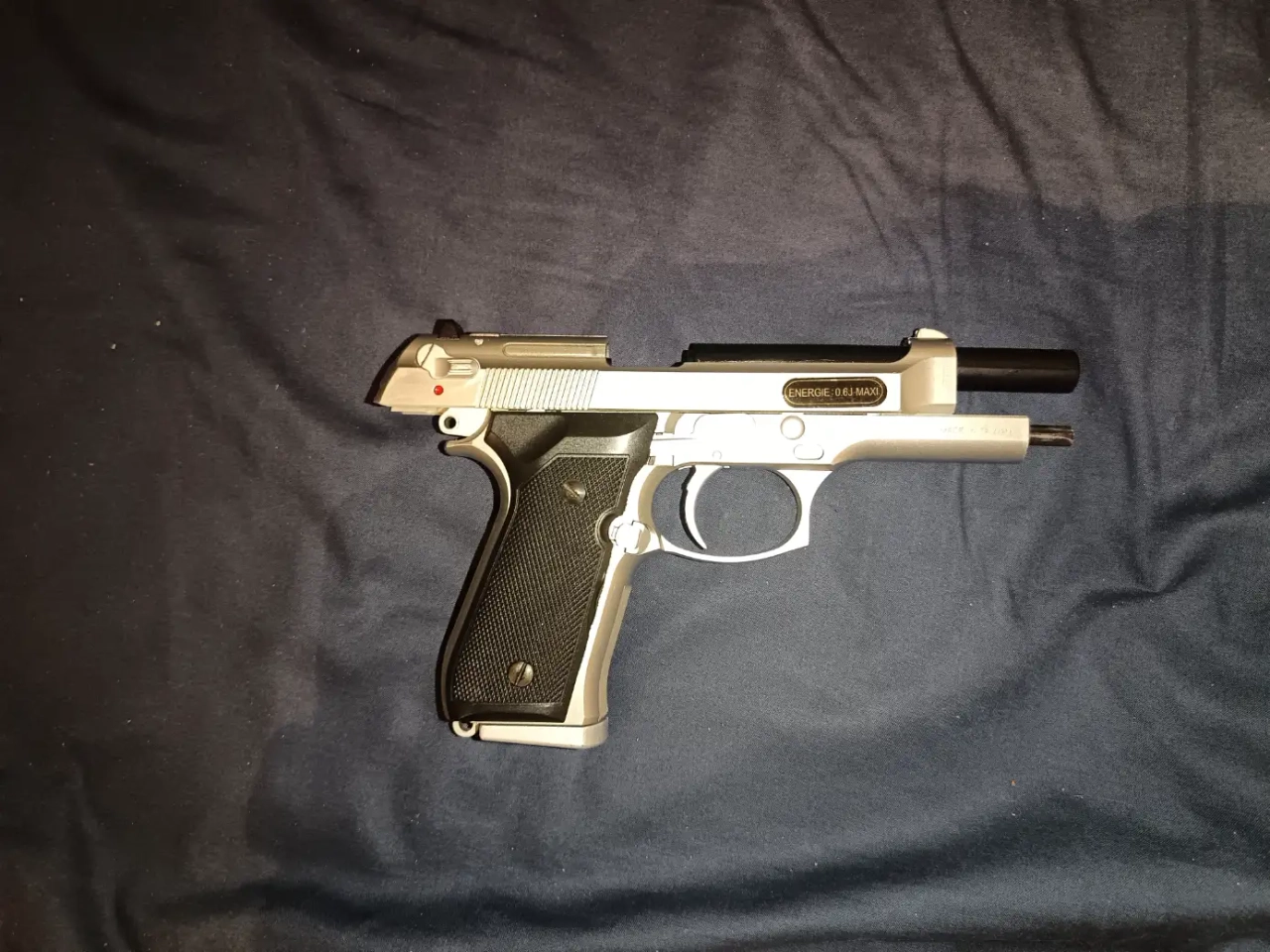 Bonjour à tous ! Je vends ici un m9 kjw silver qui a quelques années dans les pâtes.... Mais qui tourne encore comme une horloge ! La réplique a un corps en abs de bonne qualité avec un canon noir et grip noir ou imitation bois