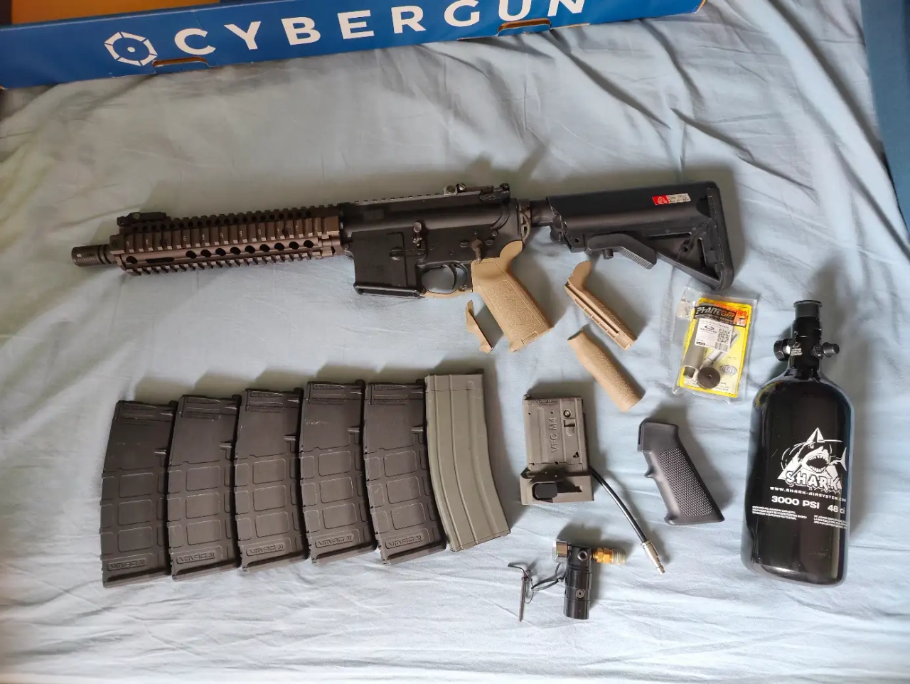 Valeur de plus de 1 200€ entre la réplique, les chargeurs GBBR, l'adaptateur, la bouteille, et le régulateur.