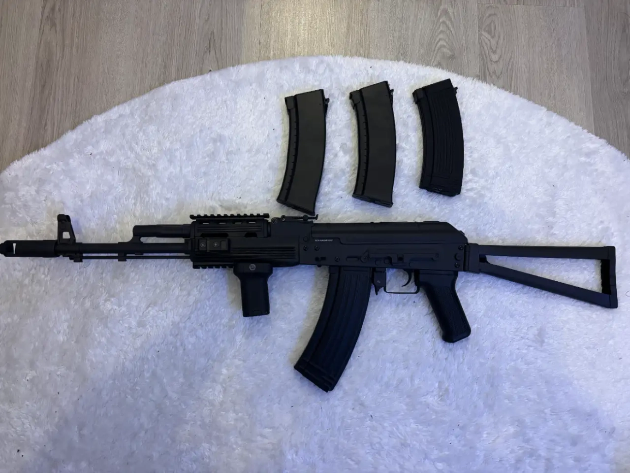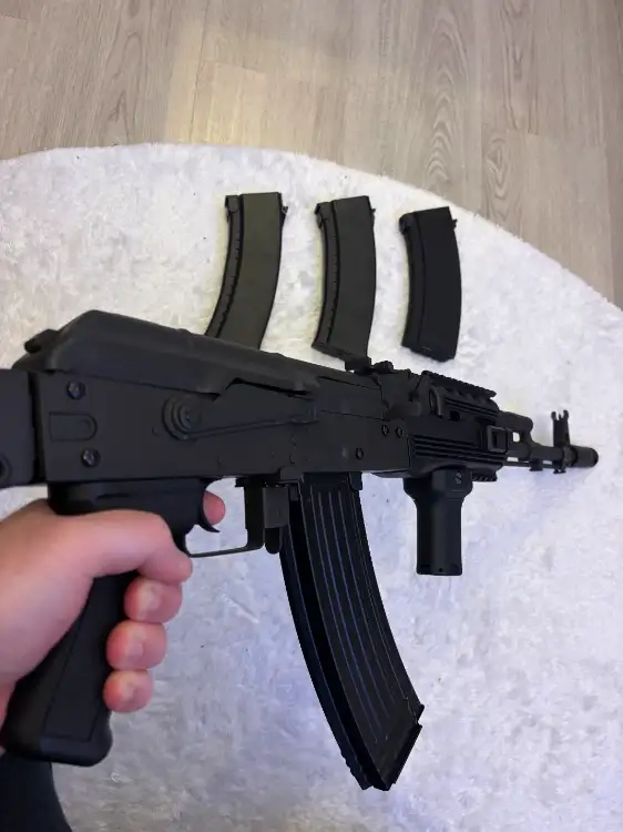 Je la vends avec 4 chargeurs en tout. 3 chargeurs mid-cap dont un en métal et un chargeur hi-cap en métal. Une poignée avant courte. 2 batteries lido 7,4V 1200mAh compatibles avec la réplique..