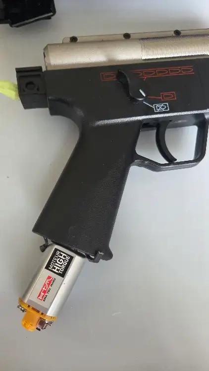 En interne, j'ai juste changé le moteur pour un Hi torque ATM (27€) et le ressort pour un SP85 (le reste fonctionnant très bien, je n'y ai pas touché). On a donc une réplique fiabilisée, avec une réactivité très correcte et une puissance de 300fps pour une portée utile d'environ 45m à la 0,28gr (maximum de distance et de grammage à disposition pour mes tests).