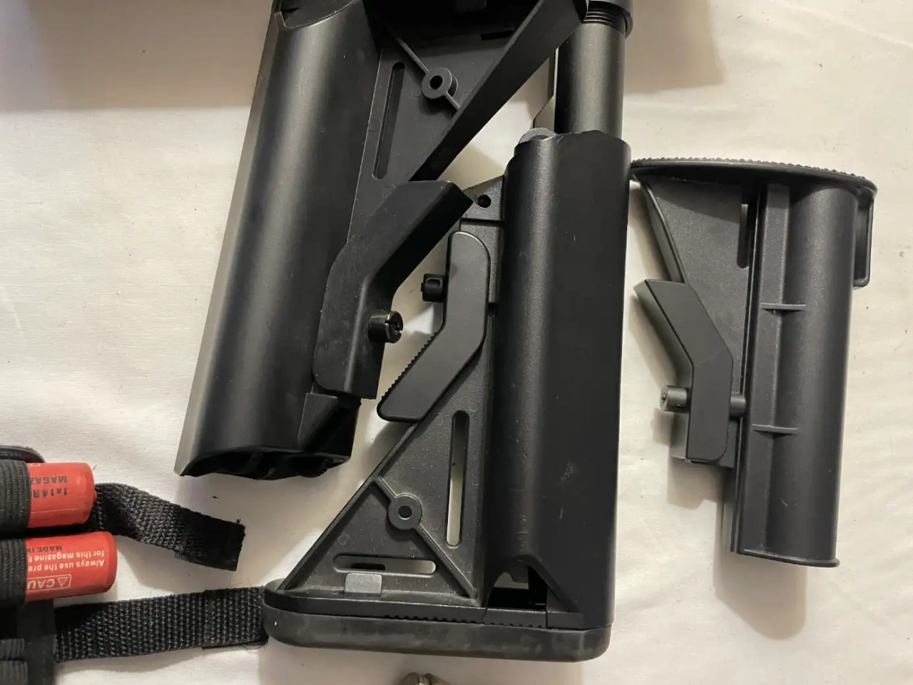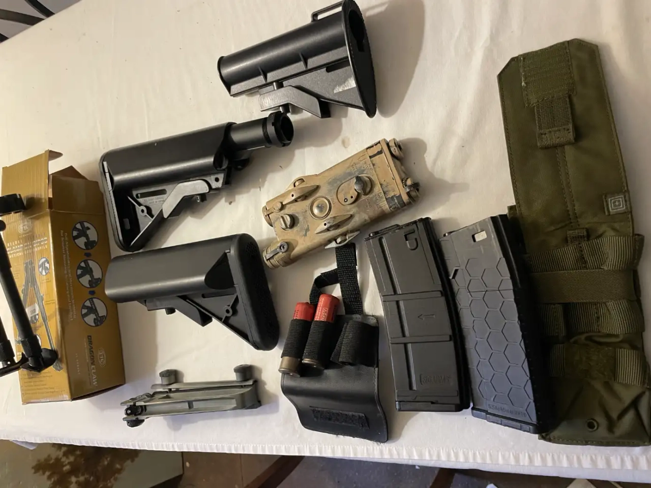 lot de pièces: 3 crosses tactiques, 2 chargeurs type M4, an PEC, porte chargeurs, un bipied