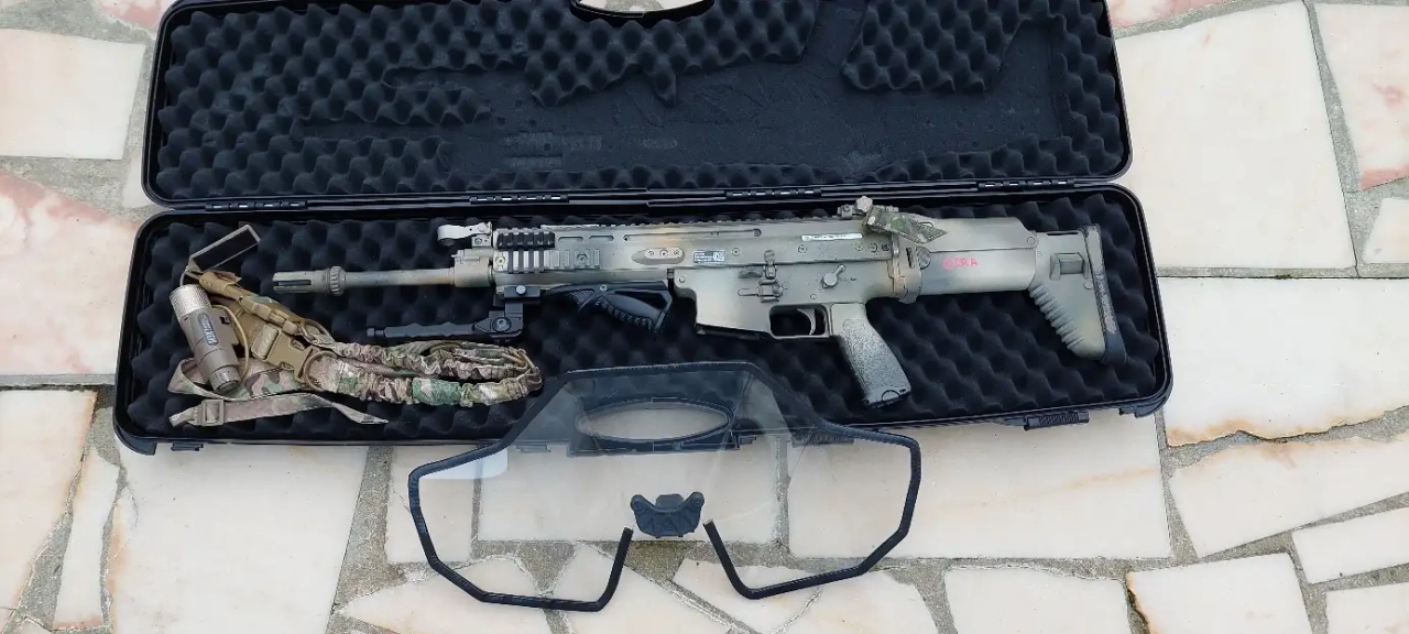 Vends SCAR-L airsoft full métal, paintjob camo Tan, réplique fiable et performante, vendue avec l’ensemble des accessoires listés ci-dessous.