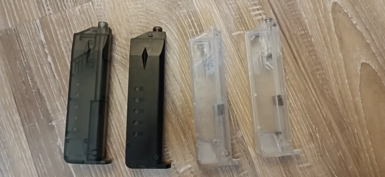 4 speedloaders, dont un à la lèvres légèrement cassé mais fonctionnel