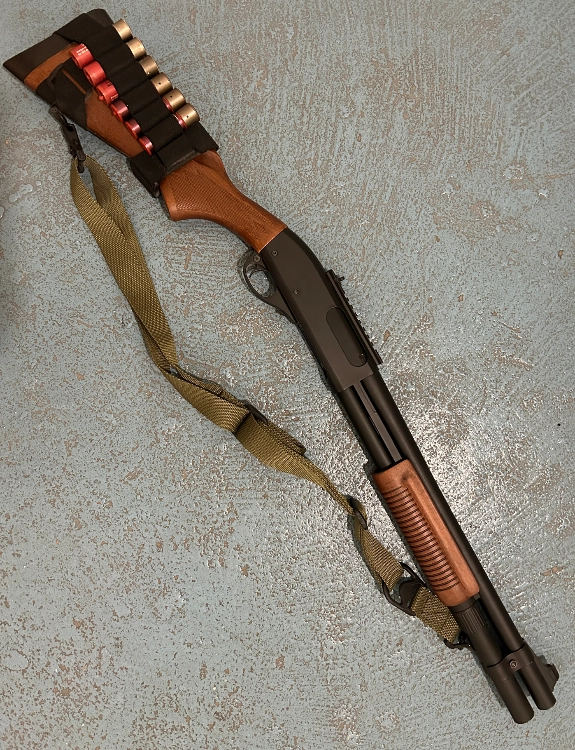 Pompe GE vrai bois et metal spring tir.x3 état neuf juste customisé par rallonge de canon,bride de canon double avec attache sangle sangle porte cartouches et cartouches 3 cartouches secutor et 3 Cyma