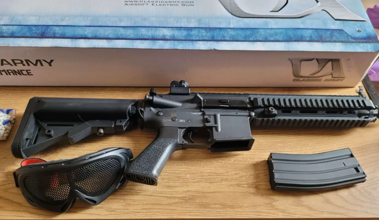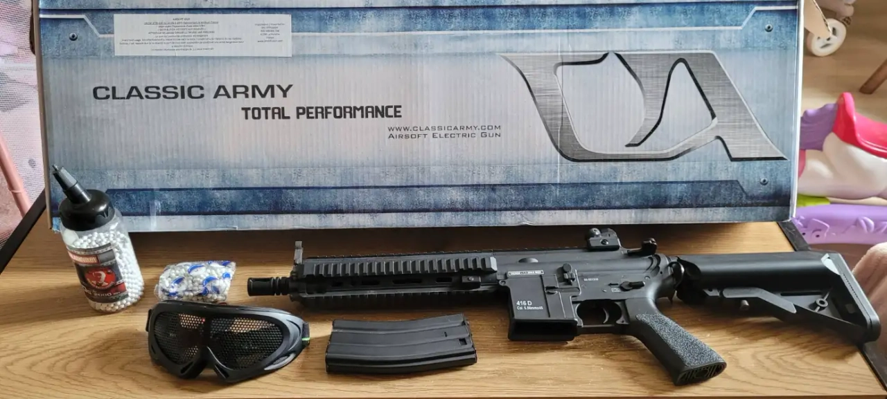 Vend HK416 utilisé seulement 2 fois, 1.1 Joules, batterie LiPo, fournis avec sa boite d'origine + lunettes de protection + recharche bille