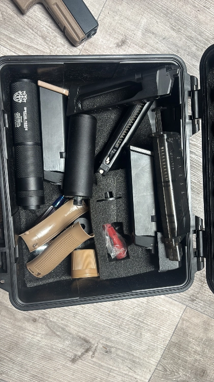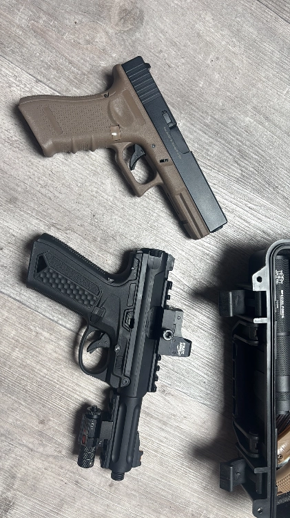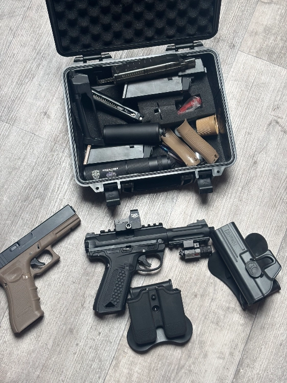 Vend lot de deux Glock avec chargeur, mallette de transport, l’accessoire de personnalisation comme des chargeurs des holster porte chargeur vision holographique, deux silencieux et un laser